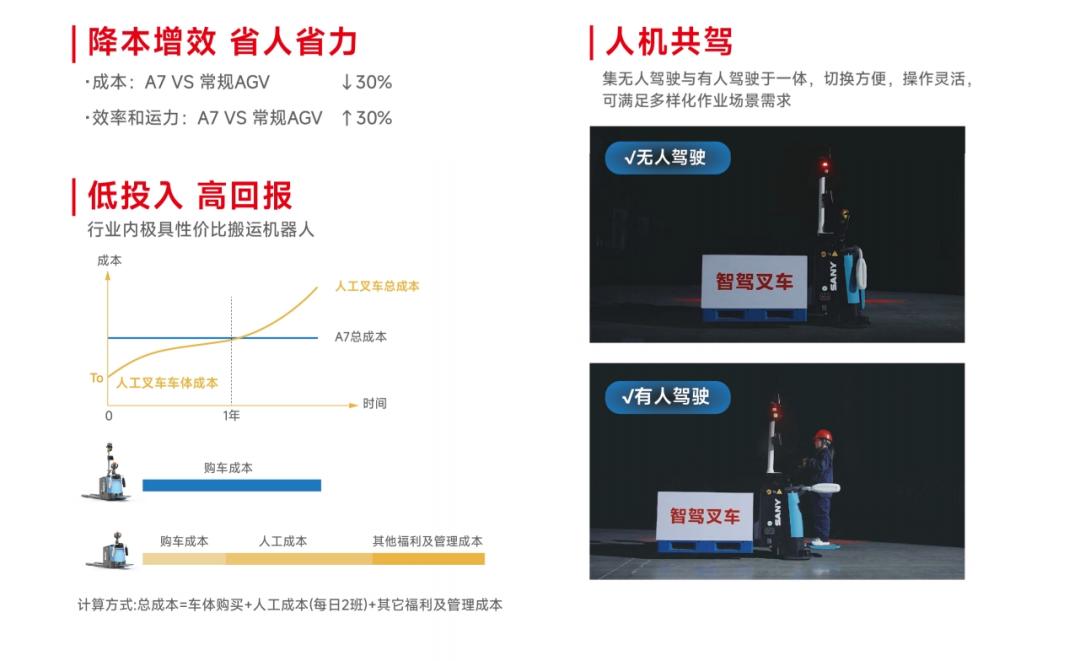 在經濟效益方面,三一A7展現出明顯競爭優勢。相比傳統AGV,整車全系自研,整體成本降低三成,但作業效率卻提升30%以上。相比人工,一臺設備可省一個搬運工人,一年即可回本。這種"省得實在,賺得明白"的特性,將為企業提供看得見的投資回報。