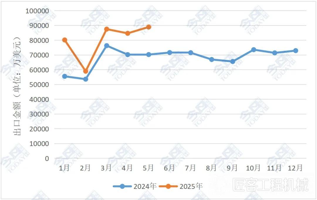 環比來看,2025年5月我國挖掘機(含履帶挖掘機和輪式挖掘機)出口總額為8.89億美元,較2025年4月的8.46億美元上升5.05%。