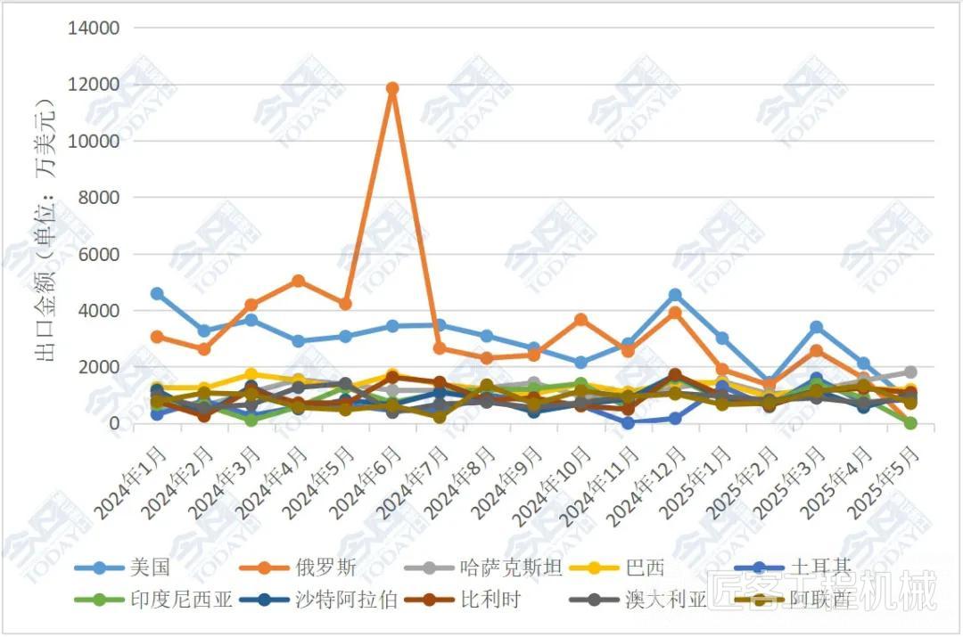 從2025年1—5月主要工程機械產品進出口貿易情況來看,對俄羅斯、美國、印度尼西亞出口金額排名位列前三,其次為沙特阿拉伯、巴西、印度、巴西、阿聯酋、澳大利亞、日本、越南。相較2025年1—4月的排名,印度上升進入前五,巴西下降至第六。