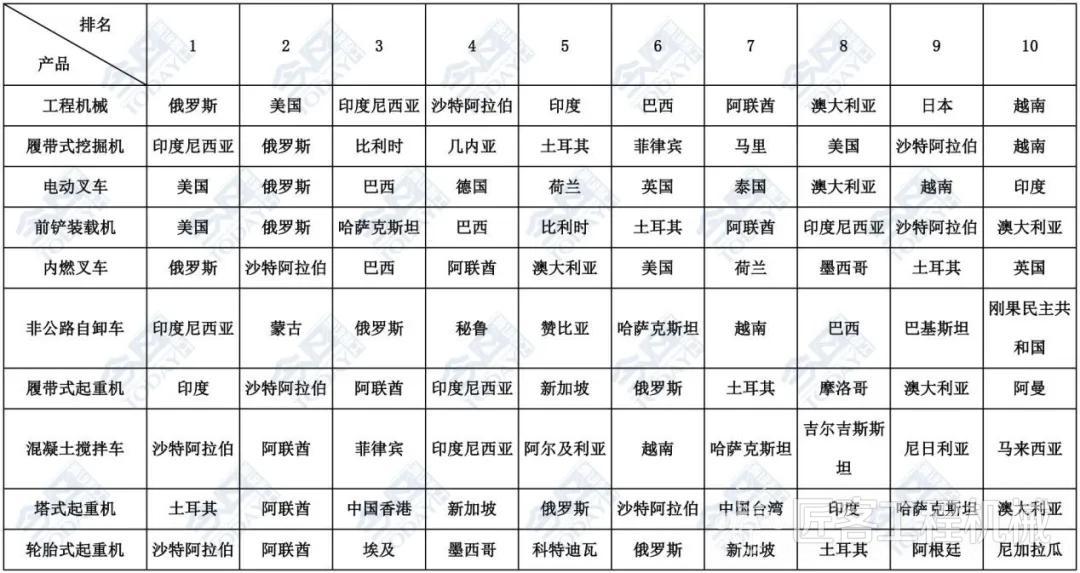 表1 2025年1-5月主要工程機械產品出口金額排名前十位國家和地區